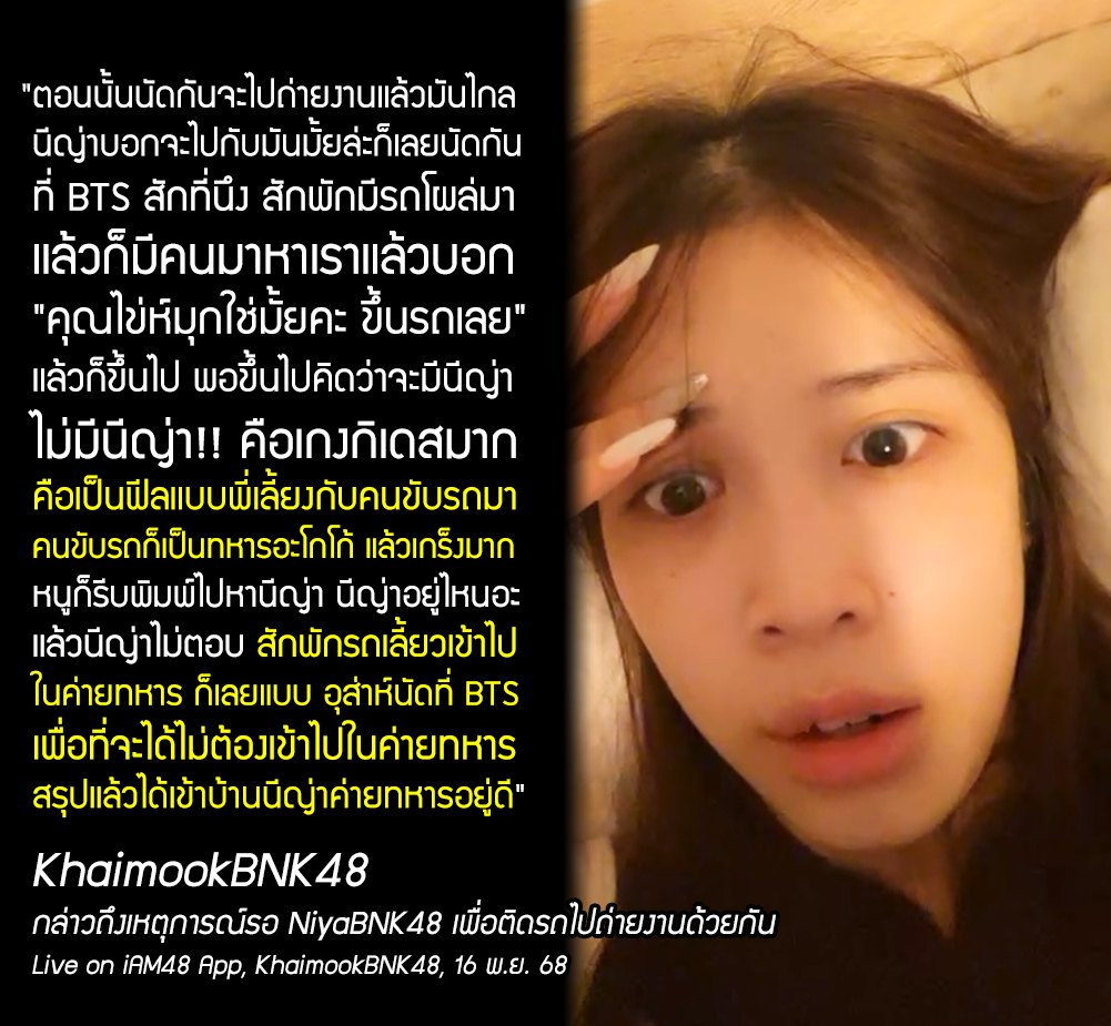 สักพักมีรถโผล่มา แล้วก็มีคนมาหาเราแล้วบอก "คุณไข่ห์มุกใช่มั้ยคะ ขึ้นรถเลย" แล้วก็ขึ้นไป พอขึ้นไปคิดว่าจะมีนีญ่า ไม่มีนีญ่า!! คือเกงกิเดสมาก คือเป็นฟีลแบบพี่เลี้ยงกับคนขับรถมา คนขับรถก็เป็นทหารอะโกโก้ แล้วเกร็งมาก หนูก็รีบพิมพ์ไปหานีญ่า นีญ่าอยู่ไหนอะ แล้วนีญ่าไม่ตอบ↔️ สักพักรถเลี้ยวเข้าไปในค่ายทหาร ก็เลยแบบ อุส่าห์นัดที่ BTS เพื่อที่จะได้ไม่ต้องเข้าไปในค่ายทหาร เพราะว่าเดี๋ยวมันจะเกร็งแล้วทำตัวไม่ถูก สรุปแล้วได้เข้าบ้านนีญ่าค่ายทหารอยู่ดี