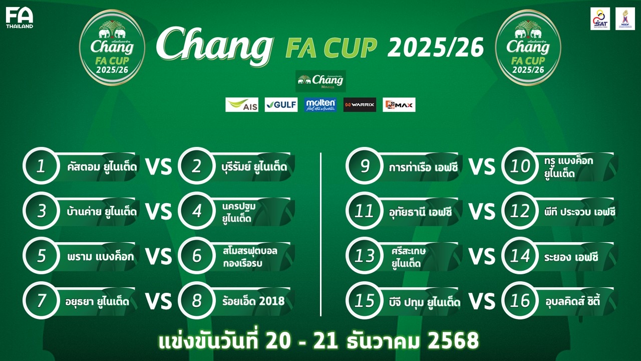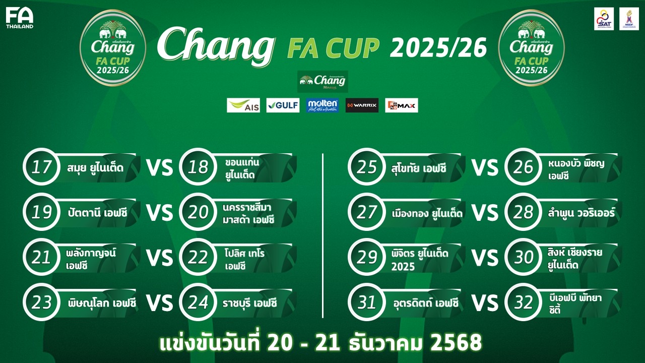 วันที่ 20 พฤศจิกายน 2568 เวลา 14.00 น. ณ ห้องเมต้า 1 ชั้น 2 สโมสรราชพฤกษ์ ได้มีพิธีจับสลากฟุตบอลถ้วยรายการ “ช้าง เอฟเอ คัพ 2025/26” รอบ 32 ทีมสุดท้าย มีดังนี้