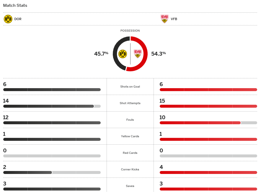 จบเกม ดอร์ทมุนด์ อึ้งเลยเสมอกับ สตุีตการ์ท 3-3 ทำให้พวกเขาหาชัยชนะไม่เจอ 3 นัดติดต่อกันในทุกรายการและถึงแม้ยังอยู่อันดับ 3 ในตารางแต่อาจโดน ไลป์ซิก ที่ยังไม่ได้ลงสนามเบียดหล่นไปอีก