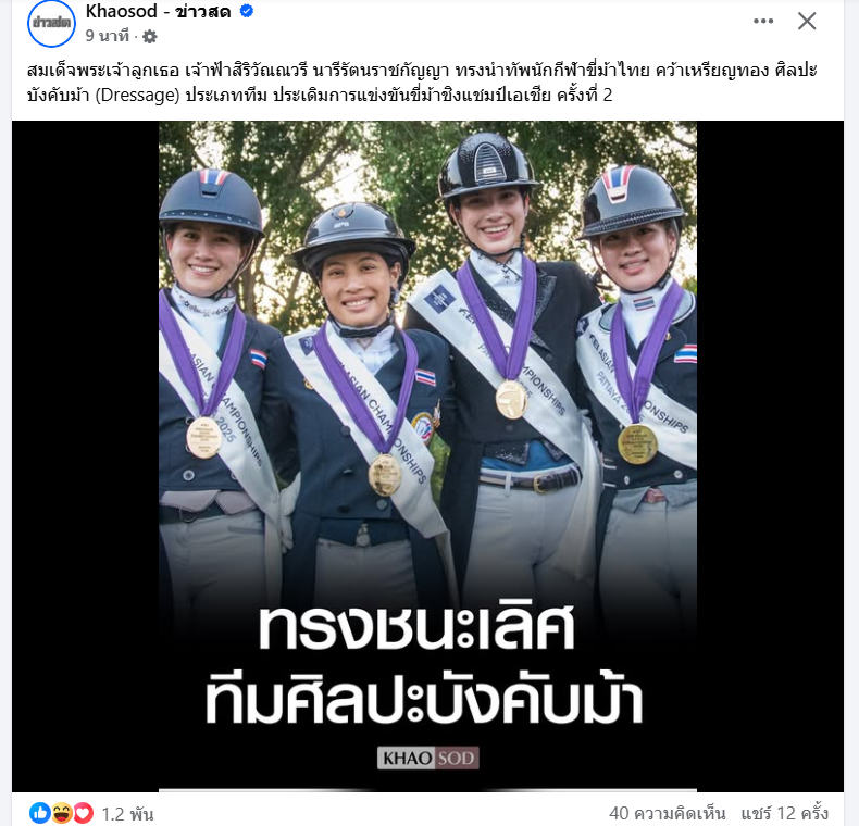 [RE: เจ้าฟ้าสิริวัณณวรี ทรงนำทีมชนะเลิศ กีฬาขี่ม้าไทย คว้าเหรียญทอง ศิลปะบังคับม้า ประเภททีม ประเดิมการแข่งขันขี่ม้าชิงแชมป์เอเชีย ครั้งที่ 2]