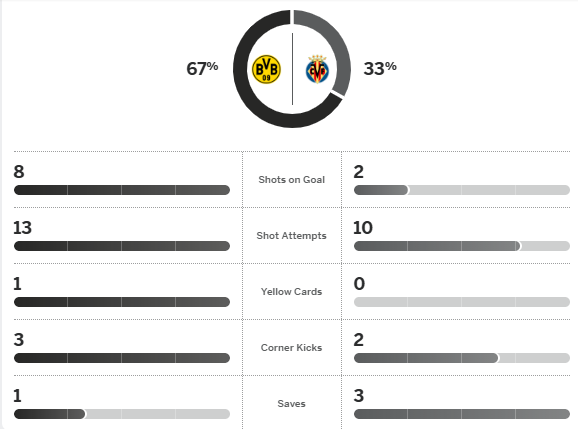 ดอร์ทมุนด์ โจมตีด้วยเตะมุมเข้าเขตโทษ บอลขลุกขลิกตกใส่ อันเซลมิโน่ ยิงเผาขนไปเข้าทาง กีราสซี่ โขกซ้ำขึ้นนำ 1-0 ฝั่ง บีญาร์เรอัล พยายามฟ้องแฮนด์แต่ VAR เช็คแล้วให้ประตู