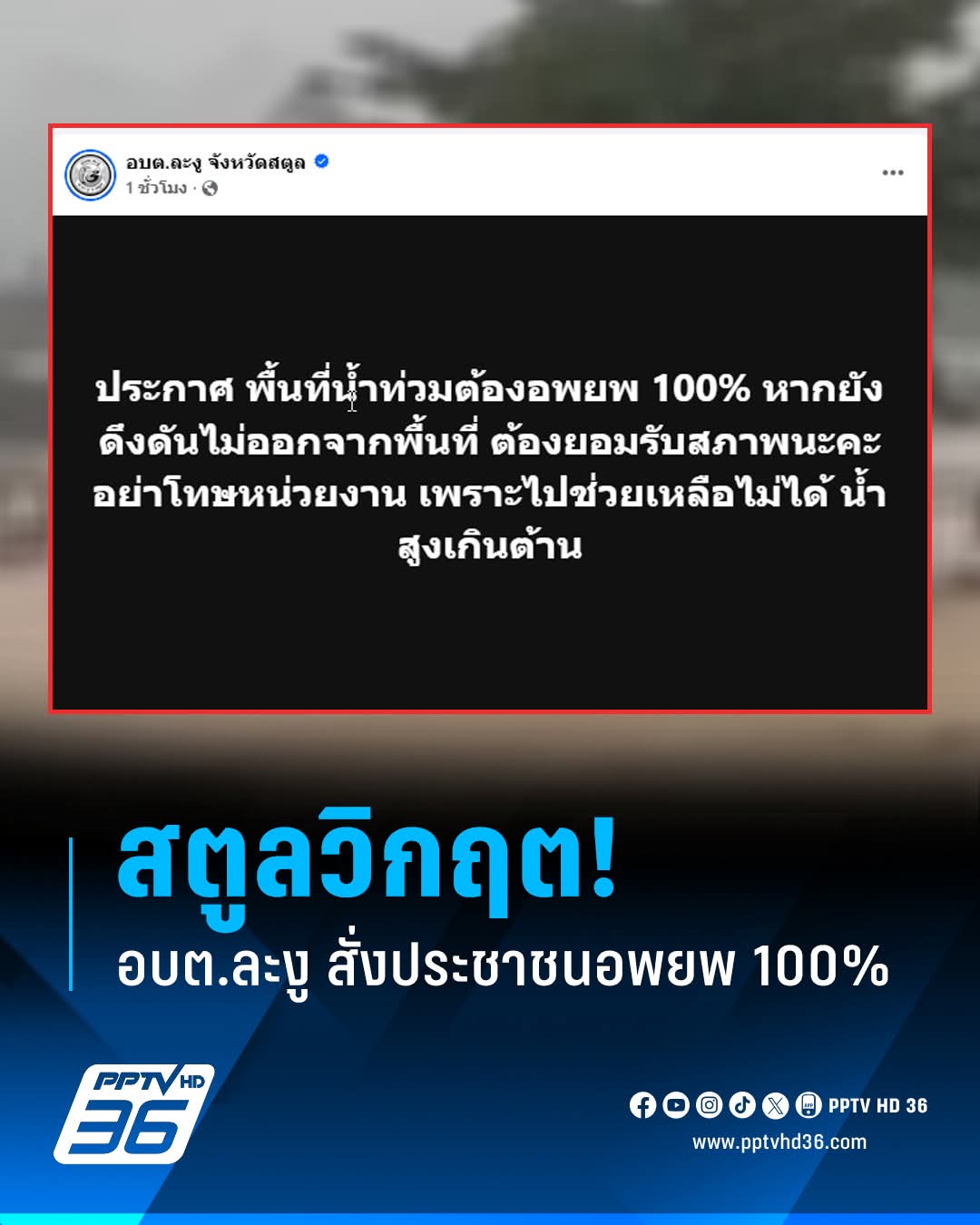 องค์การบริหารส่วนตำบลละงู จังหวัดสตูล ออกประกาศแจ้งเตือนประชาชนในพื้นที่เสี่ยงน้ำท่วม ขอให้อพยพออกจากพื้นที่ 100% ทันที หลังระดับน้ำเพิ่มสูงต่อเนื่องจนไม่สามารถเข้าพื้นที่ช่วยเหลือได้อย่างปลอดภัย