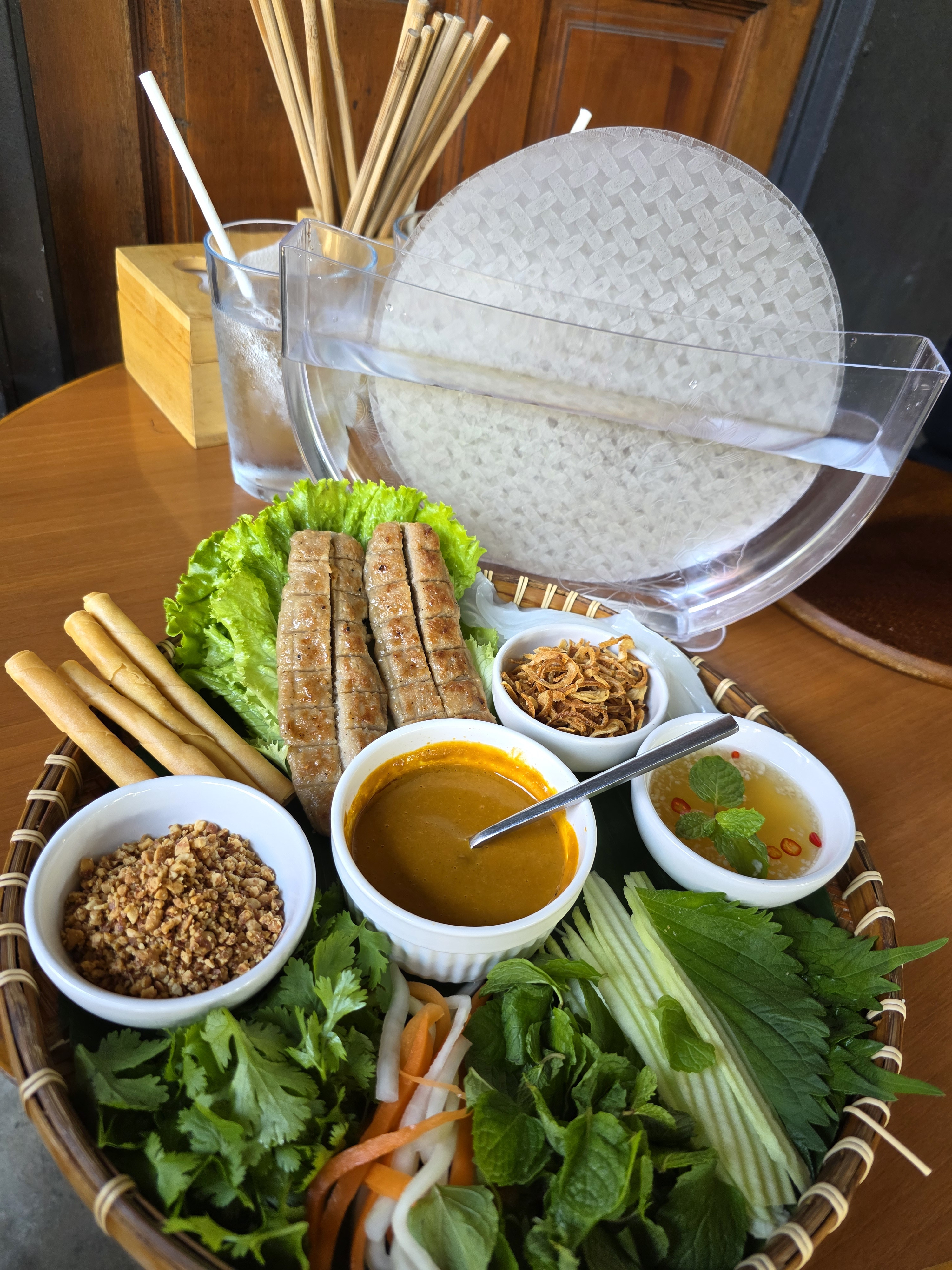 แหนมเนืองอร่อยๆมาก ชุดเล็ก มี 4 คำใหญ่ ใส่เครื่องทั้งหมดอย่างละหน่อยแล้วห่อให้พอดีกัด คล้ายๆโรล รสสัมผัสมีหลากหลาย เคี้ยวอร่อยมากๆ