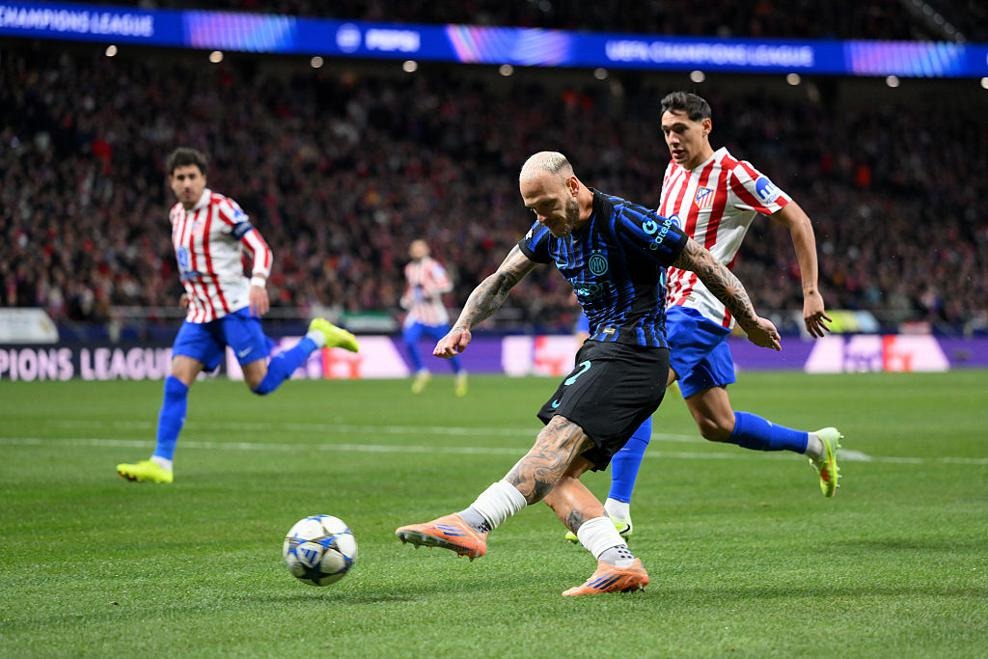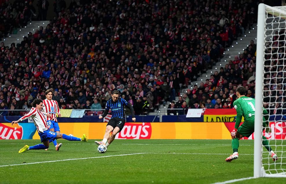 เกือบจะเป็นประตูให้ อินเตอร์ ตีเสมอเข้าแล้วเมื่อ แอตฯ มาดริด หน้าเขตโทษตัวเองจ่ายไม่ดี บาเรลล่า เลยวิ่งมาเก็บแล้วหักเข้ากลางไม่มีเพื่อนชาร์จ บิสเซ็ค ยังไขว้ให้ ดิมาร์โก้ หน้าเขตโทษเล็งแล้วยิงหลุดกรอบไปหน่อย