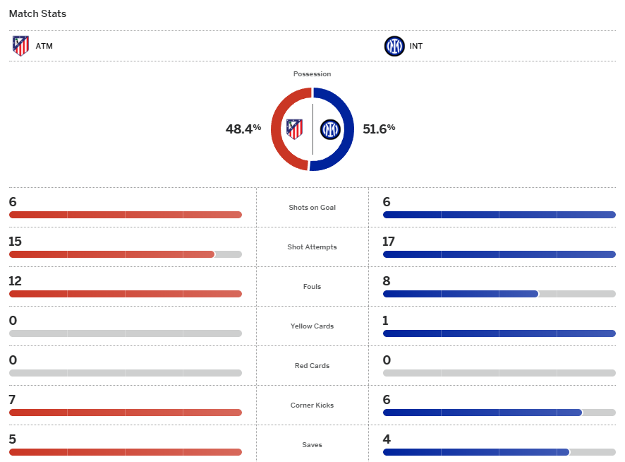 นึกว่าจะจบลงด้วยผลเสมอแล้วเมื่อ แอตเลติโก้ มาดริด นำตั้งแต่นาทีที่ 6 จาก ฮูเลี่ยน อัลวาเรซ และถึงแม้จะถูกไล่ตีเสมอมาแต่ทดเจ็บก็เป็นโฮเซ่ กิเมเนซ โขกเตะมุมพา ตราหมี คว้าชัยเหนือ อินเตอร์ มิลาน 2-1