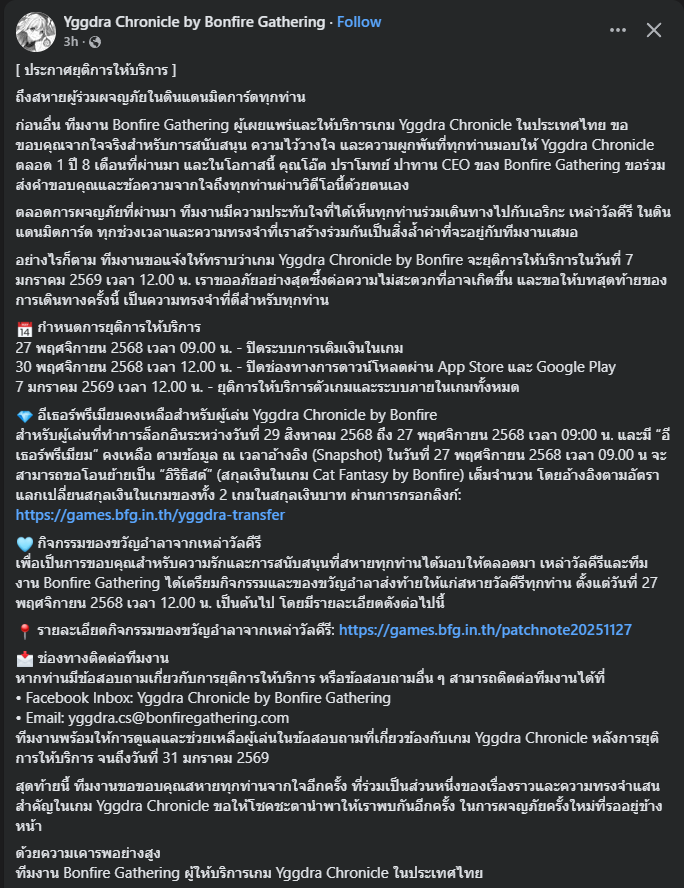 ประกาศยุติการให้บริการ Yggdra Chronicle ในประเทศไทย