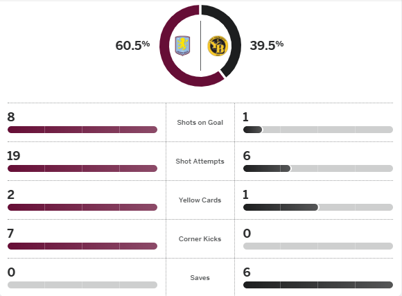 วิลล่า มาเรื่อยๆ โรเจอร์ส เรียกฟรีคิกระยะ 25 หลา ตีเลอมองส์ ยิงตรงตัวโกล์ จากน้ันไม่นานเป็น มาตเซ่น ได้ส่องไกลบ้างข้ามคาน