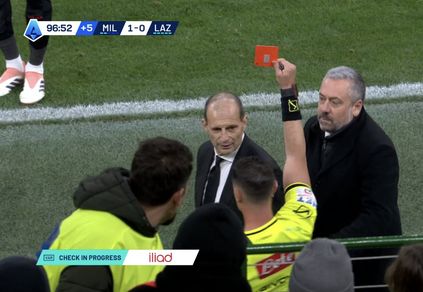 เกือบมีดราม่าท้ายเกม VAR เช็คจุดโทษจังหวะโดนข้อศอก พาฟโลวิช ผู้ตัดสินไปเช็คมอนิเตอร์แต่ก็ไม่ได้เป่าจุดโทษแต่อย่างใด แต่ อัลเลกรี โดนใบแดงเพราะโวยกรรมการ
