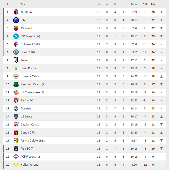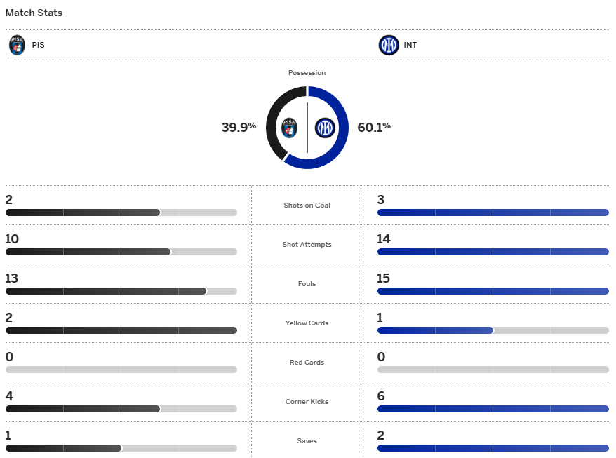 จบเกม อินเตอร์ เอาชนะ ปิซ่า ไปได้ 2-0 ทำให้พวกเขากลับมาคว้าชัยหลังแพ้ 2 นัดติดและขยับขึ้นมาเป็นรองจ่าฝูงชั่วคราวซึ่งพวกเขาจะโดนเบียดหล่นลงไปแน่นอนเพราะ โรม่า กับ นาโปลี จะเจอกันเองในคู่ดึก