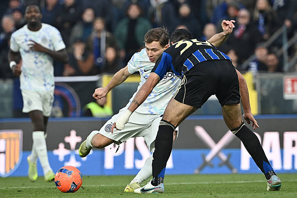 เข้าท้ายครึ่งแรก อินเตอร์ มีลุ้นเอาประตูนำอีกครั้งจากลูกครอสเข้าเขตโทษหลุดออกไปทางขวา บาเรลล่า เก็บได้เปิดไซด์ก้อยกลับเข้าไปตรงกลางจบด้วย เลาตาโร่ วอลเล่ย์บอลข้ามคานออกหลัง