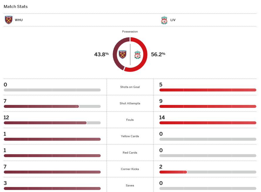 จบครึ่งแรก ลิเวอร์พูล ครองบอลและหากโอกาสยิงได้ดีกว่าแต่ไม่คมพอที่จะขึ้นนำ ส่วนเวสต์แฮมแทบไม่มีโอกาสส่องให้อลิสซอนได้ออกแรง