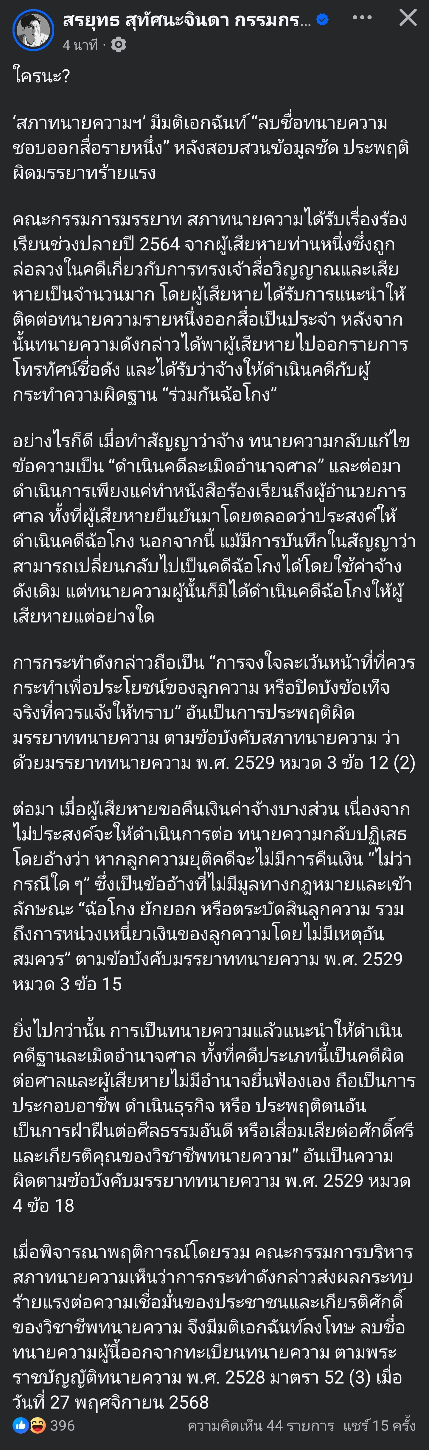 [RE: สภาทนายความ มีมติเอกฉันท์ ลบชื่อทนายความ 'ชอบออกสื่อรายหนึ่ง']