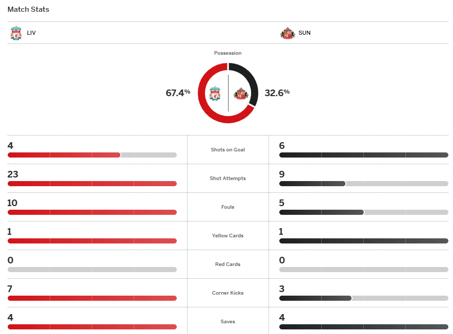 ลิเวอร์พูล เกือบคาบ้าน 3 นัดติดต่อกันหลังโดน เชมส์ดีน ทัลบี้ ยิงแฉลบขึ้นนำไปก่อน แต่ยังรอดเมื่อฟลอเรียน เวียร์ตซ์ ลากไปยิงแฉลบนอร์ดี้ มูคิเอเล่ เปลี่ยนทางเข้าประตูตัวเองทำให้เสมอ ซันเดอร์แลนด์ 1-1 ไปแบบหงอยๆ