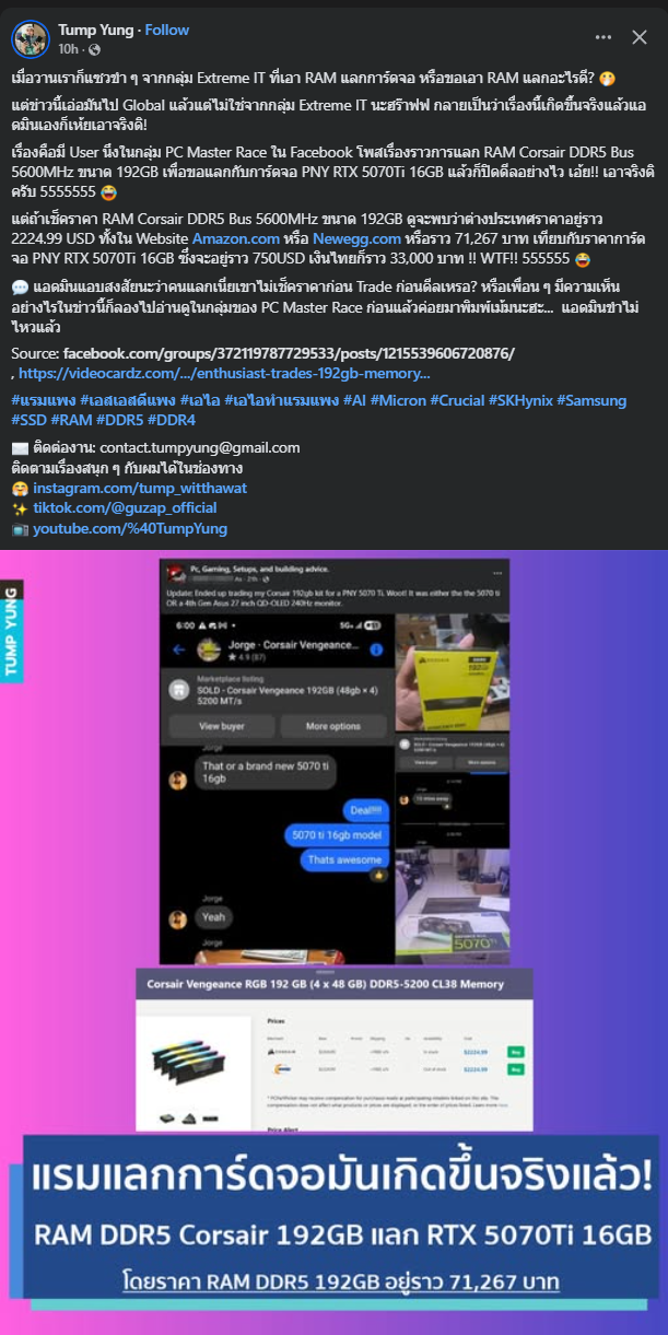 (ต่างประเทศ) เกิดขึ้นแล้ว เอาแรม 192GB แลกการ์ดจอ 5070 Ti 16GB