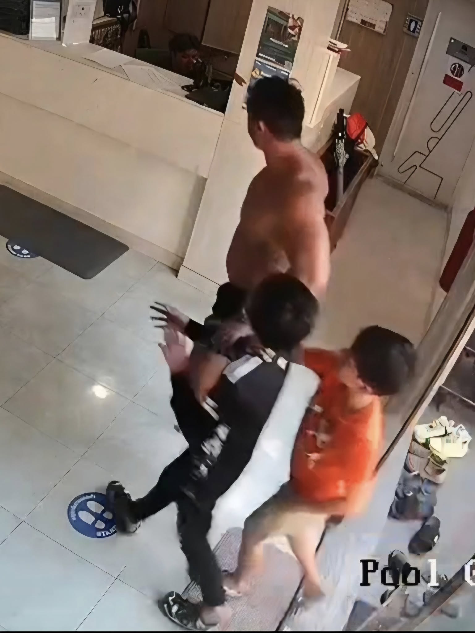 ในคลิปจะเห็นได้ชัดว่าเด็กๆกลัวมากยกมือขึ้นป้องหัว เพราะกลัวโดนอีก เค้ารวบข้อมือเด็กทั้งสองข้างพร้อมกัน ลากกลับเข้าไปในพื้นที่ล๊อบบี้ พร้อมตะโกนกับ จนท.ที่เคาเตอร์ ว่า...