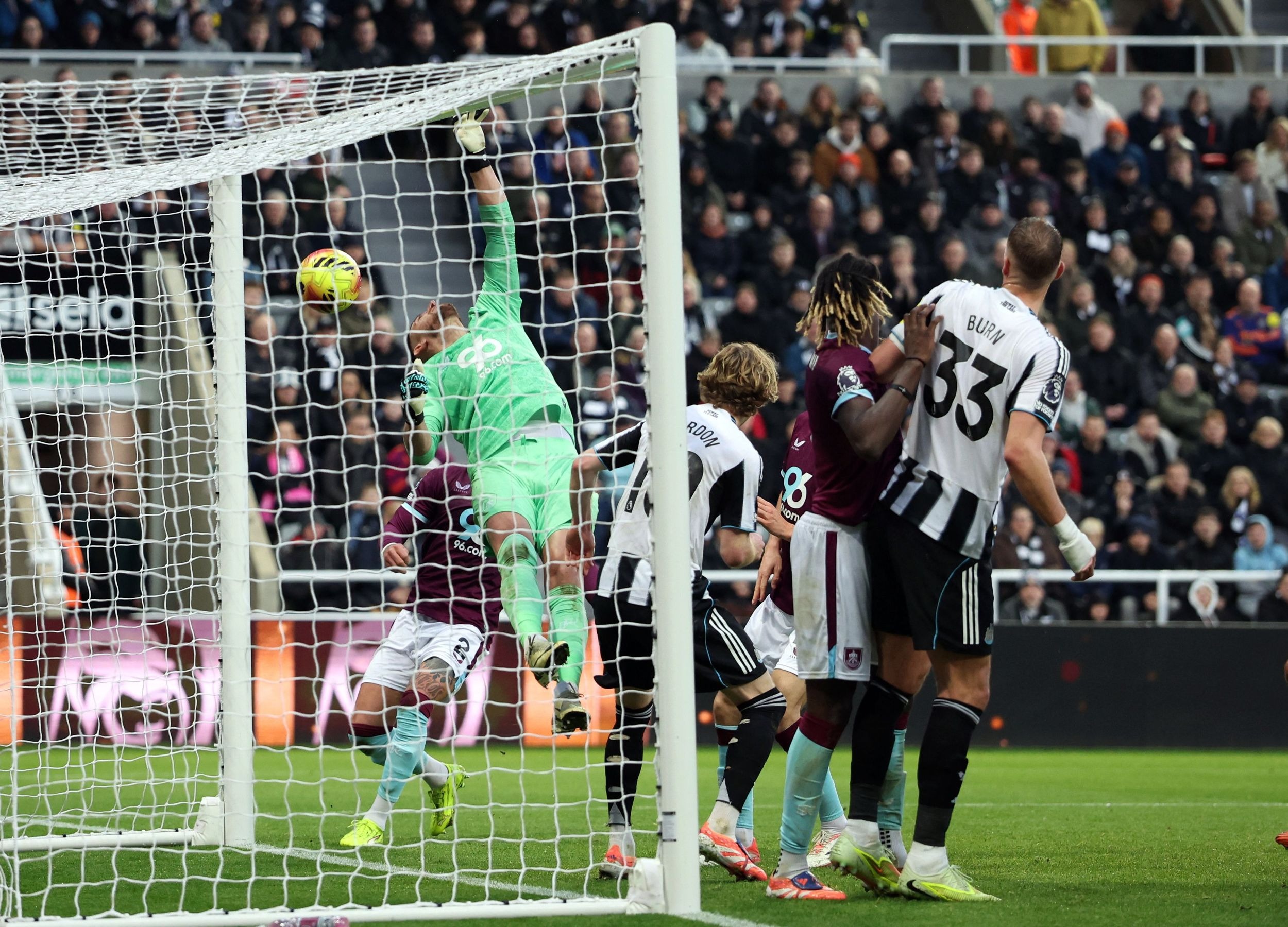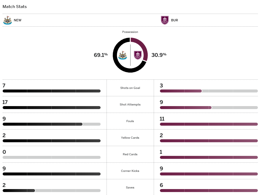 นิวคาสเซิ่ล ยูไนเต็ด ได้ประตูออกนำไปก่อนกับ บรูโน่ กีมาไรส์ เปิดเตะมุมลอยเข้าประตูไปเลยก่อนจะได้เปรียบยิ่งขึ้นเมื่อ เบิร์นลี่ย์ ต้องมาเหลือ 10 คนตามด้วย แอนโธนี่ กอร์ดอน ยิงจุดโทษเพิ่ม ทดเจ็บ สาลิกาดง ต้องเสียวหน่อยโดนไล่มาแต่ยังคว้าชัย 2-1 ขึ้นมาอยู่ครึ่งบนของตารางแบบชั่วคราวมี 22 แต้ม