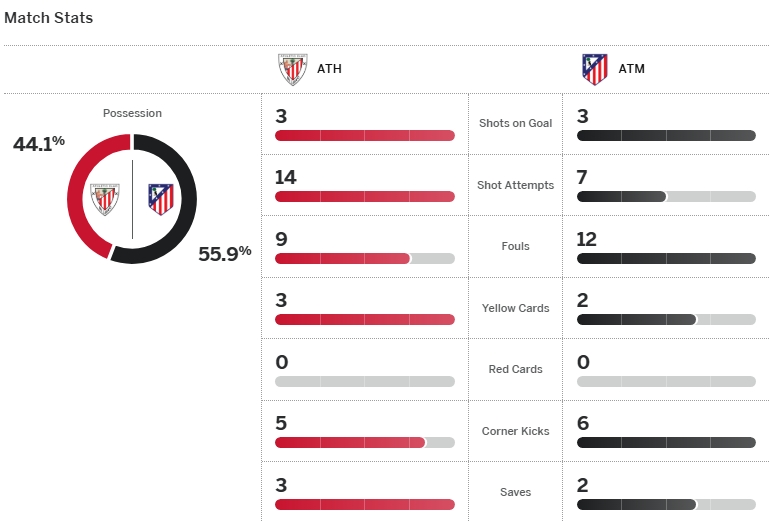 จบเกม แอตเลติโก้ มาดริด บุกแพ้ แอธเลติก บิลเบา 1-0 ยังมี 31 คะแนนจาก 16 เกม ส่วน บิลเบา ขึ้นมารั้งที่ 7 มี 23 แต้ม
