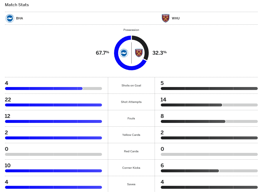จบเกมที่เปิดแลกกันสนุกไปด้วยการเสมอกันระหว่างไบรท์ตันกับเวสต์แฮม ยูไนเต็ด 1-1 แบ่งกันไปทีมละแต้มในท้ายที่สุด