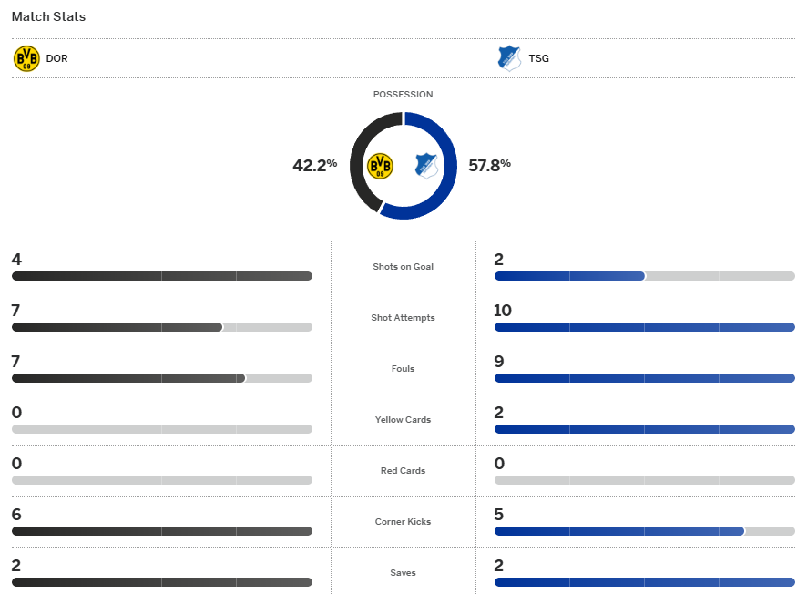 จบเกม ดอร์ทมุนด์ เอาชนะ ฮอฟเฟ่นไฮม์ 2-0 ทำให้พวกเขาเก็บชัย 2 นัดติดในลีกและยังครองอันดับ 3 ต่อไปและรักษาช่องว่างกับหัวตารางไว้ที่เท่าเดิม