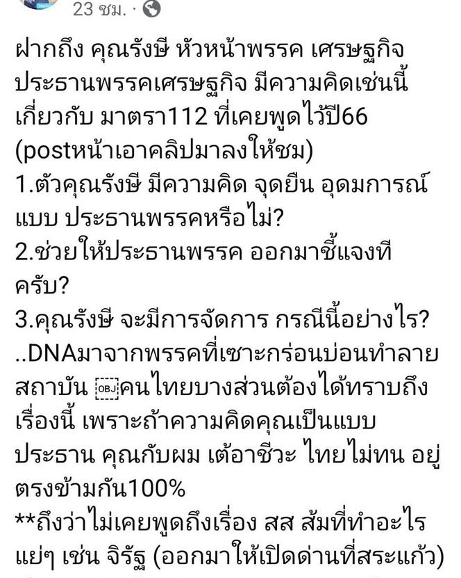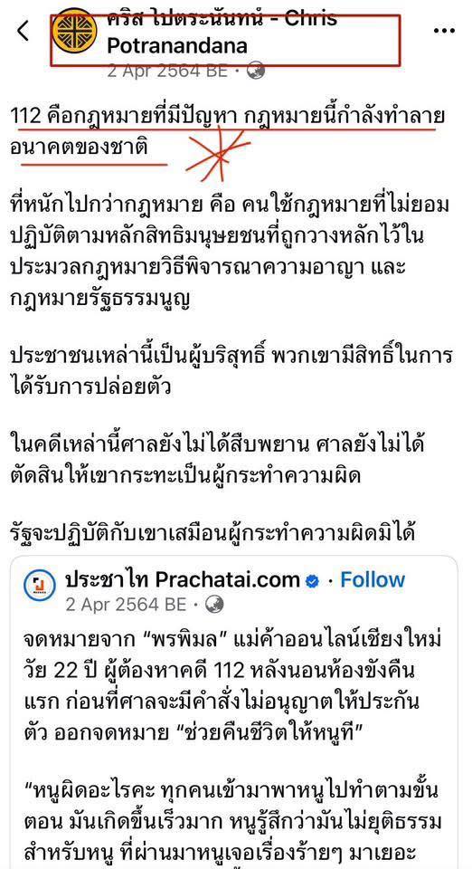 คนที่โดนคือ ประธานพรรค คริส โปตระนันทน์ ที่เคยมีความเห็นเกี่ยวกับม.112เอาไว้ แถมเคยอยู่พรรคส้มด้วย