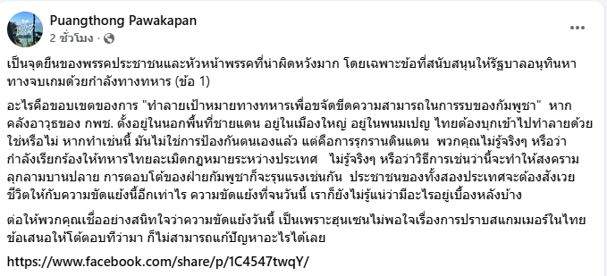 อันนี้ความเห็นของผมคนเดียวเลยนะที่มีต่อ อ.พวงทอง คนเดียว แล้วคนที่ชายแดนเขาจะอยู่ยังไงครับ ยอมรับเลยครับว่าไม่มีใครอยากได้ สงครามหรอก แต่ในเมื่อมันยิงเราแถมมันไม่ยิงในสมรภูมิด้วย ชายบ้านในชายแดน เกิดอันตรายอยู่อาศัยไม่ได้ใครรับผิดชอบครับ ผมว่า อ.ก็รับผิดชอบไม่ไหวอ่ะ เหมือนกัน