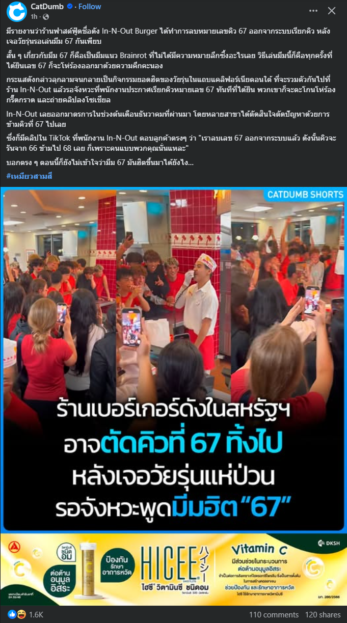 ร้านเบอร์เกอร์ดังในสหรัฐ ตัดคิวที่ 67 ทิ้ง หลังเจอวัยรุ่นแห่ป่วนมีมฮิต "67"