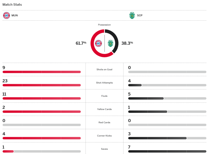 จบเกม บาเยิร์น เอาชนะ สปอร์ติ้ง ไปได้ 3-1 ยืดสถิติไร้พ่ายในเกมเหย้าของแชมเปี้ยนส์ลีกรอบแบ่งกลุ่ม/ลีกเฟสเพิ่มเป็น 37 นัดติดและขยับไปมี 15 แต้มเหลือเกมให้ลงอีก 2 นัดโอกาสผ่านเข้ารอบอัตโนมัติสูงลิ่ว