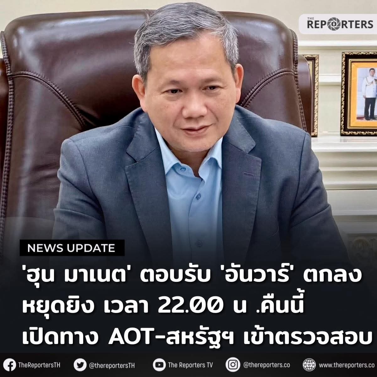 UPDATE: 'ฮุน มาเนต' ตอบรับ 'อันวาร์' ตกลงหยุดยิง เวลา 22.00 น.คืนนี้ เปิดทาง AOT-สหรัฐฯ เข้าตรวจสอบ