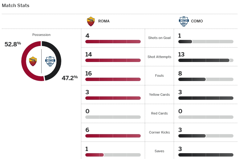 จบเกม อาแอส โรม่า บ้านเอาชนะ โคโม่ 1-0 เก็บเพิ่มเป็น 30 คะแนนจาก 15 เกม นัดต่อไปเจองานหนัก ออกไปเยือน ยูเวนตุส ทีมอันดับ 5