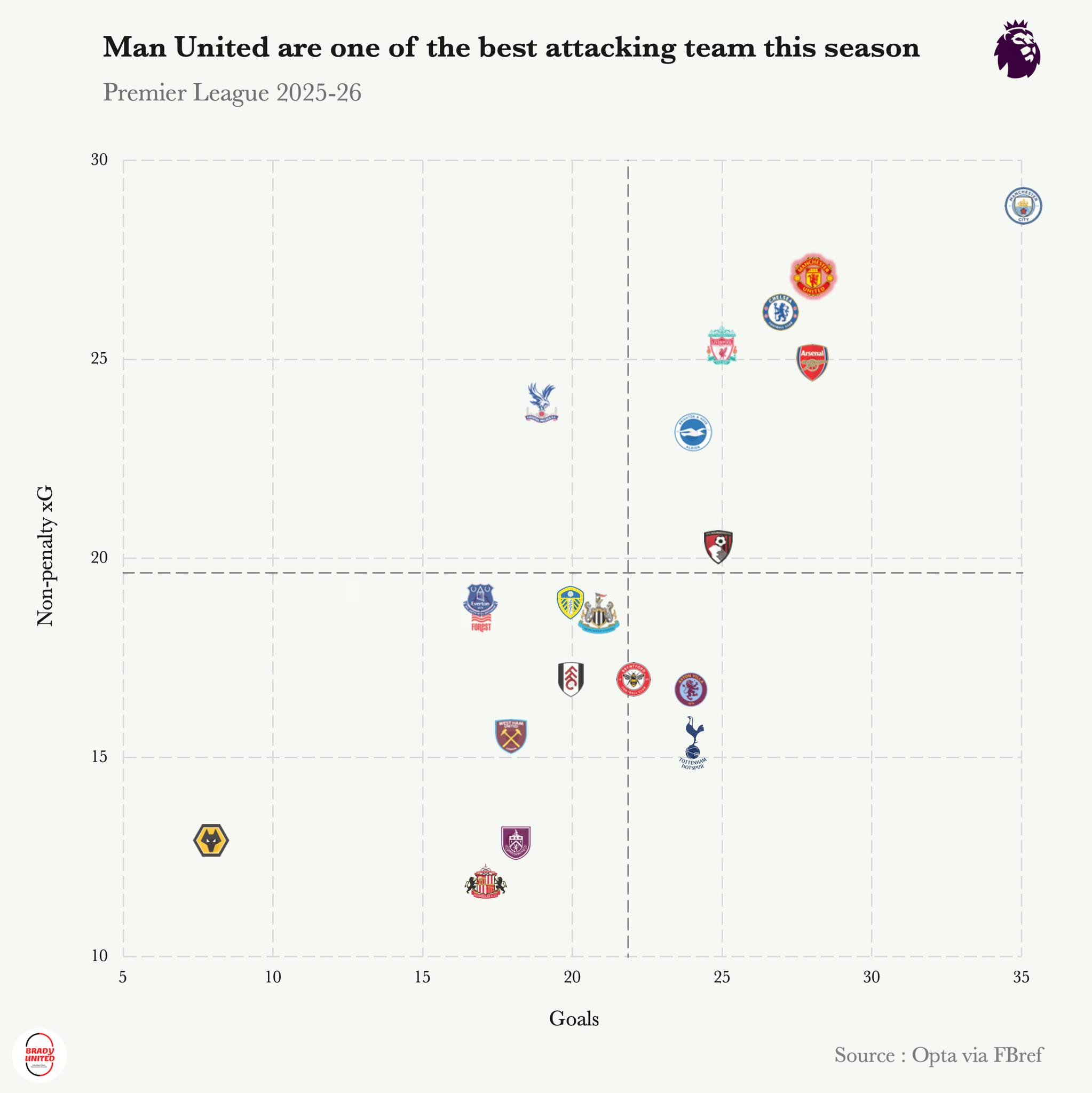 แมนยูเป็นทีมที่ มีเกมรุก (โอกาสทำประตู + ประตู) ดีที่สุดในลีค รองจากซิตี้