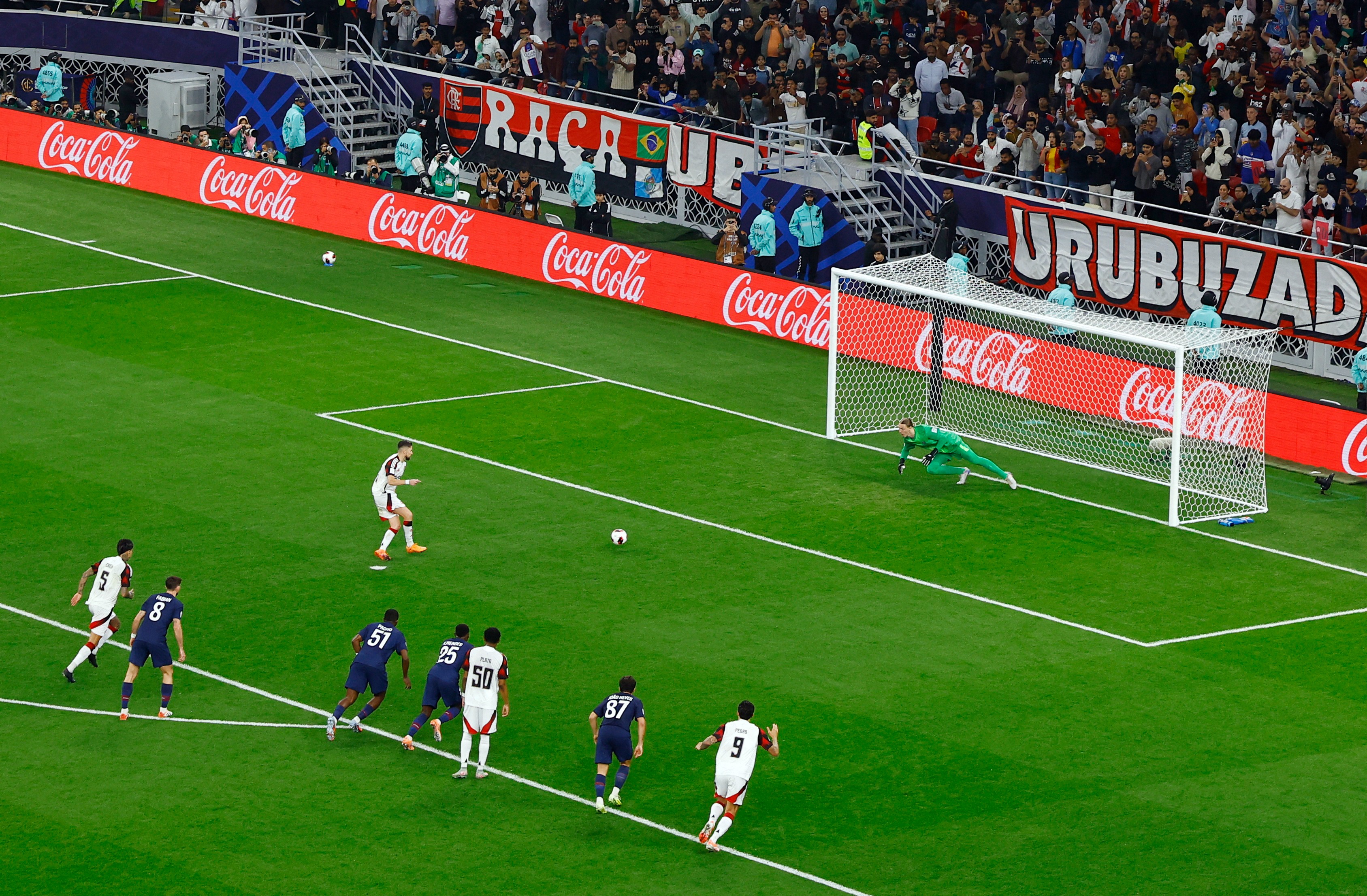 เล่นไปเล่นมา ฟลาเมนโก้ ได้จุดโทษในจังหวะลูกทุ่มเกือบสุดมุมธงของ เปแอสเช แล้วเตะสาดขึ้นหน้าติดแฉลบเด้งมาหา เด อาร์ราสคาเอต้า ในเขตโทษล็อกหลบแต่โดน มาร์ควินญอส เตะสกัดมาเลยทิ้งตัวล้มลงไปและหลังจากเปาไปดูภาพช้าข้างสนามก็กลับมาแจกจุดโทษ