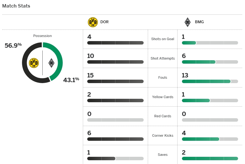 โบรุสเซีย ดอร์ทมุนด์ ขึ้นนำได้อย่างรวดเร็วจากประตูของ ยูเลียน บรันท์ ในนาทีที่ 10 และครองเกมได้เหนือกว่า แม้ในบางช่วงจะเกือบเสียประตูจากการสวนกลับของ โบรุสเซีย มึนเช่นกลัดบัค อย่างไรก็ตาม พวกเขาสามารถรักษาสกอร์เอาไว้ได้จนถึงนาทีที่ 90+7 ก่อนจะได้ประตูปิดกล่องจาก มักซิมิเลียน ไบเออร์ จบเกมเอาชนะไปด้วยสกอร์ 1-0 พร้อมทำแต้มแซง แอร์เบ ไลป์ซิก ขึ้นไปรั้งรองจ่าฝูงได้สำเร็จ