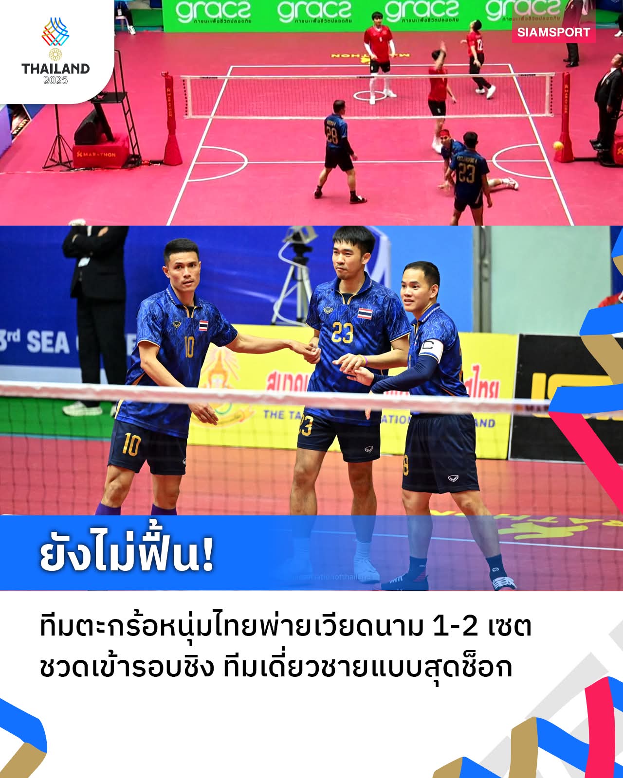 ทีมตะกร้อชายทีมชาติไทยยังไม่ฟื้น เรียกฟอร์มเก่งกลับมาไม่ได้ได้ ล่าสุด ความผิดหวังยังไม่จบลงง่ายๆ เมื่อถูก เวียดนามย้ำแค้น อีกครั้ง ในประเภท ทีมเดี่ยวชาย พ่ายไปแบบเหลือเชื่อ 1-2 เซต ด้วยสกอร์ 13-15, 15-6, 9-15 ทำให้ชวดผ่านเข้าสู่รอบชิงชนะเลิศไปอย่างช็อกแฟนกีฬาได้แค่เหรีญทองแดง