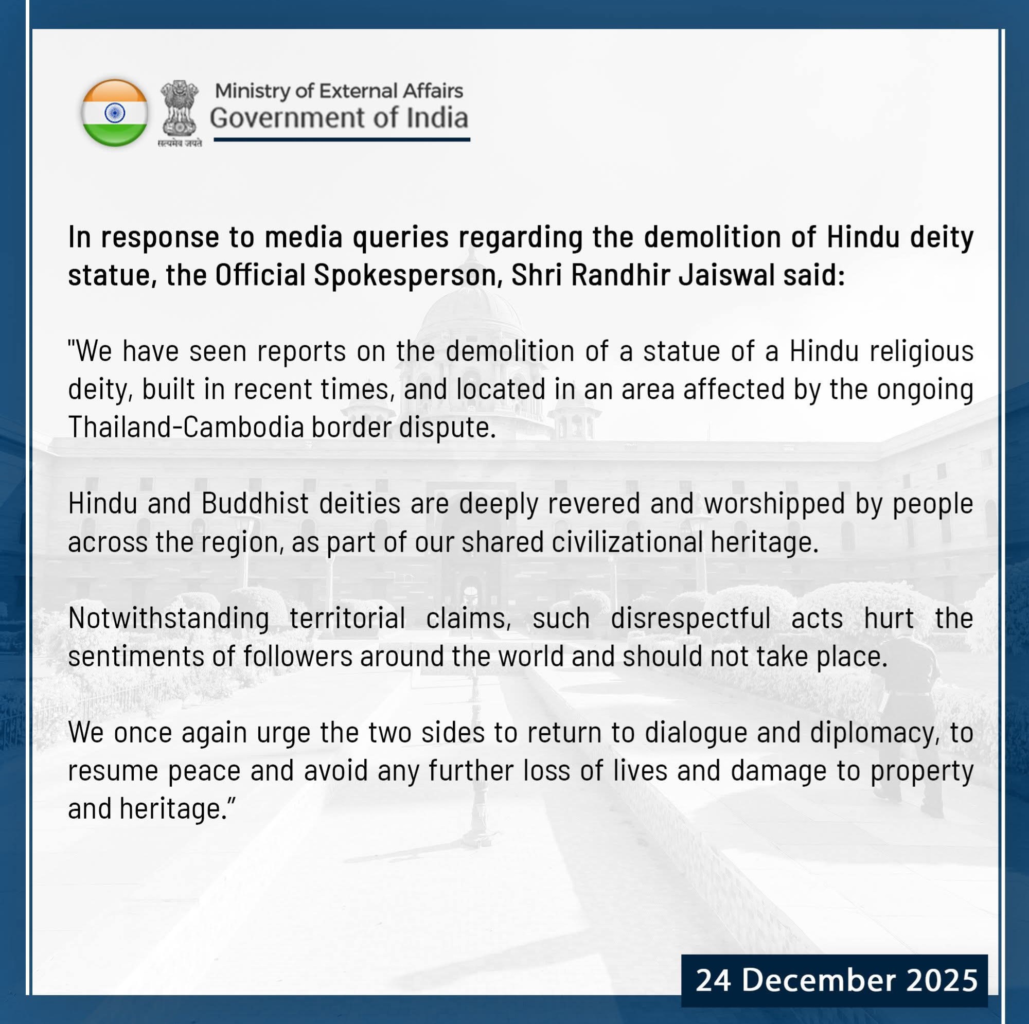 กระทรวงการต่างประเทศอินเดียออกแถลงการณ์แสดงความไม่พอใจอย่างรุนแรง ต่อกรณีที่กองทัพไทยดำเนินการรื้อถอนรูปปั้นเทพเจ้าฮินดูในพื้นที่ช่องอานม้า ซึ่งเป็นพื้นที่พิพาทชายแดนไทย-กัมพูชา โดยระบุว่าเป็นการกระทำที่ขาดความเคารพต่อมรดกทางอารยธรรมและจิตใจ