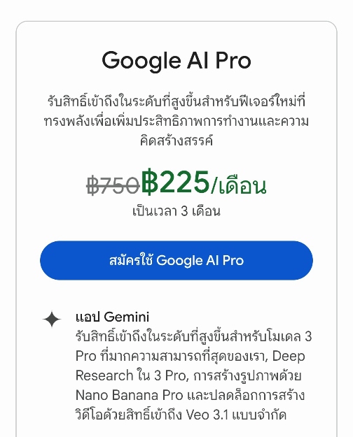 เมื่อไม่กี่เดือนก่อนมีให้ใช้ AI Pro ได้ฟรี 1 ปี สำหรับนักศึกษา คนที่ไม่ได้เป็นนักศึกษา ให้สมัครผ่าน thaimooc ก่อน ตอนนั้นเห็นแล้วแหละแต่มองข้ามไป ไม่ได้สนใจ เพราะว่าใช้ ChatGPT เสียตังค์ก็โอเคอยู่แล้ว แต่มาตอนนี้ได้ยินหลายเสียงบอกกันเป็นเสียงเดียวกันว่า Gemini ดีกว่า เลยสนใจอยากลองใช้ Gemini ดูบ้างว่าดีกว่าอย่างไร จะใช้แบบเสียเงิน มีวิธีจ่ายให้ถูกกว่าเดือนละ 225 บาทไหม ที่แจกฟรี 1 ปี น่าจะหมดเขตไปแล้วล่ะมั้ง