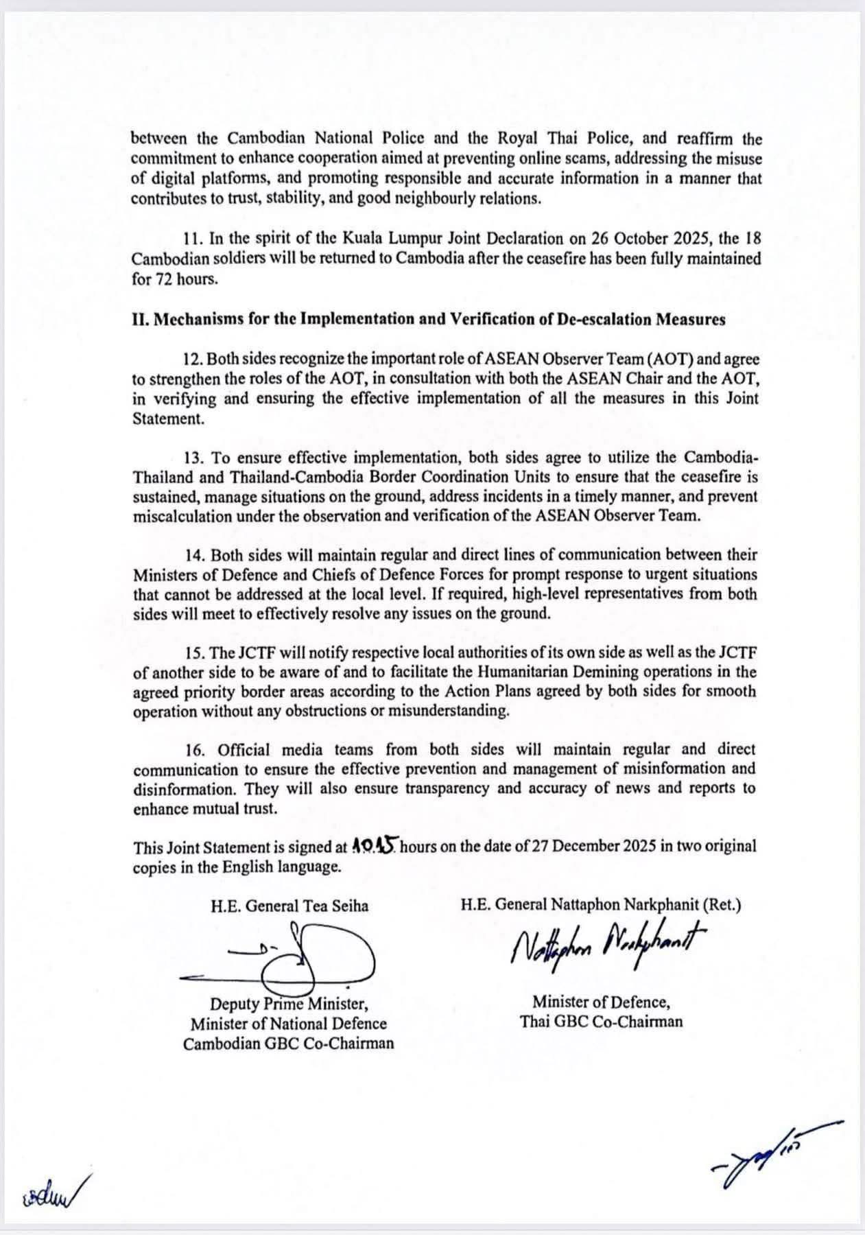 ไทย-กัมพูชา ลงนามในข้อตกลงหยุดยิงแล้ว >เที่ยงวันนี้ (12.00 ของวันที่ 27 ธ.ค.)<