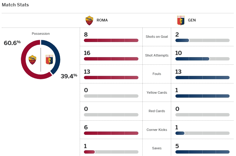 อาแอส โรม่า ตุนสกอร์ไว้ตั้งแต่ครึ่งแรก หลังได้ประตูจาก มาติอัส ซูเล่, มานู โคเน่ และ อีแวน เฟอร์กูสัน ทำให้ครึ่งหลังเล่นสบายแล้วพยายามประคองเกมไว้ แม้จะถูก เจนัว ไล่ตีไข่แตกในช่วงท้ายเกม แต่เจ้าบ้านยังเปิดรังเอาชนะไปได้ไม่ยากเย็นนัก 3-1 เก็บสามแต้มสำคัญ พร้อมแซง ยูเวนตุส ขึ้นไปรั้งอันดับ 4 ได้สำเร็จ