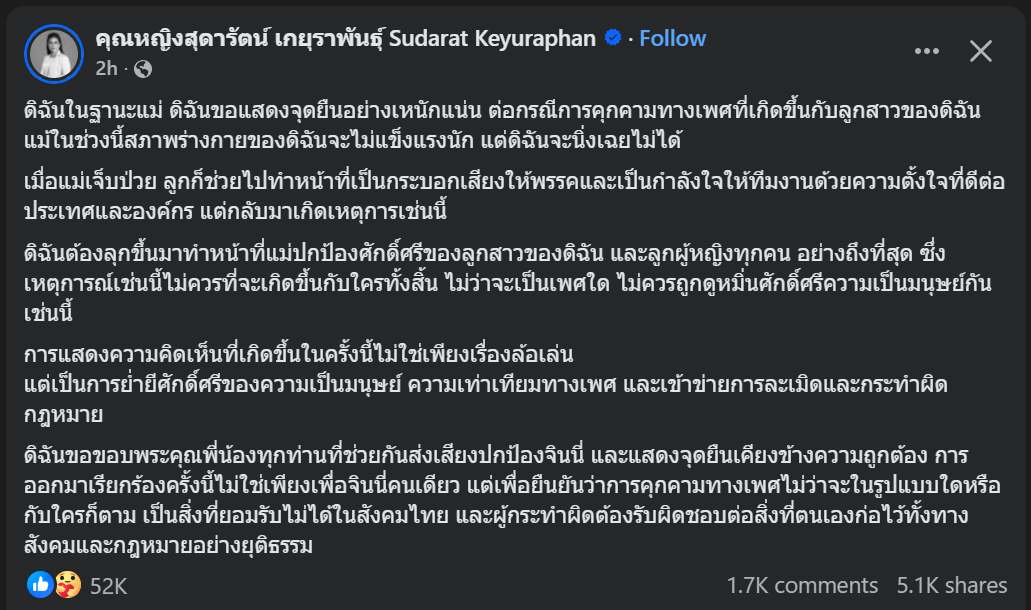 [RE: ดิฉันขอแสดงจุดยืนอย่างเหนักแน่น ต่อกรณีการคุกคามทางเพศที่เกิดขึ้นกับลูกสาว]