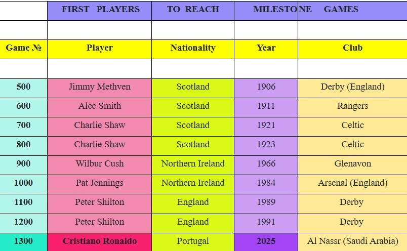 สหพันธ์ประวัติศาสตร์และสถิติฟุตบอลนานาชาติ (IFFHS) ระบุอีกว่า โรนัลโด้ คือนักเตะที่ไม่ได้มีเชื้อสายสหราชอาณาจักรคนแรกที่ทำสถิติดังกล่าว โดยก่อนหน้านี้ ปีเตอร์ ชิลตัน ตำนานโกลทีมชาติอังกฤษ เคยทำสถิติลงสนาม 1,200 นัด เมื่อปี 1991 ระหว่างเฝ้าเสาให้ดาร์บี้ เค้าน์ตี้