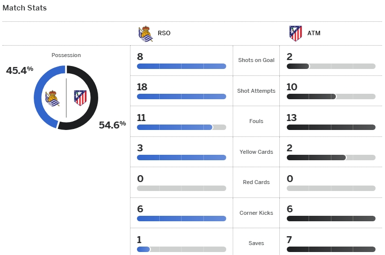 แอตเลติโก้ มาดริด ทำแต้มหล่นประเดิมศักราชใหม่ แม้ว่าขึ้นนำก่อนจาก อเล็กซานเดอร์ ซอร์ล็อธ นาที่ที่ 50 แต่แล้วจากนั้นไม่นาน เรอัล โซเซียดาด ก็มาได้ประตูตีเสมอทันควันจาก กอนซาโล่ เกเดส นาทีที่ 55 จบเกมแบ่งแต้มกันไป ทำให้ทีมของ ดิเอโก้ ซิเมโน่ ยังอยู่อันดับ 4 แต่แต้มเท่า บีญาร์เรอัล อันดับ 3 ที่ประตูได้เสียดีกว่า