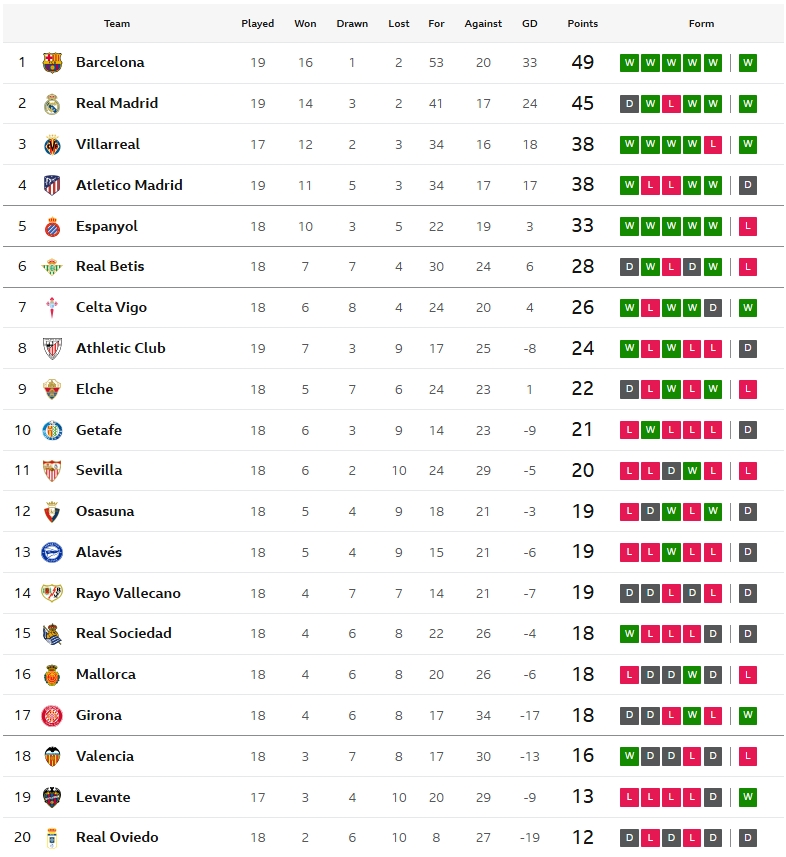 ส่วน แอตเลติโก้ มาดริด มี 38 คะแนนจาก 19 นัด อยู่ที่ 4 แต้มเท่า บีญาร์เรอัล อันดับ 3