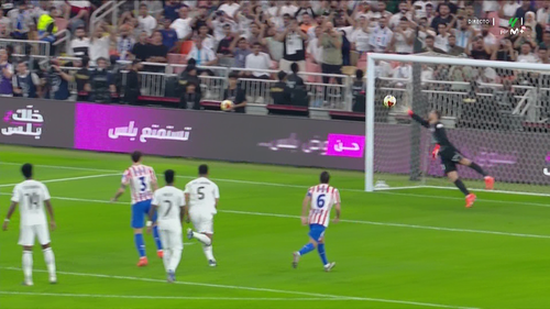 เบลลิ่งแฮม ครอสจากแดนกลางเข้าฝั่งซ้ายเขตโทษมี วินิซิอุส สอดโขกแต่โดนใต้ลูกย้อยข้ามคาน