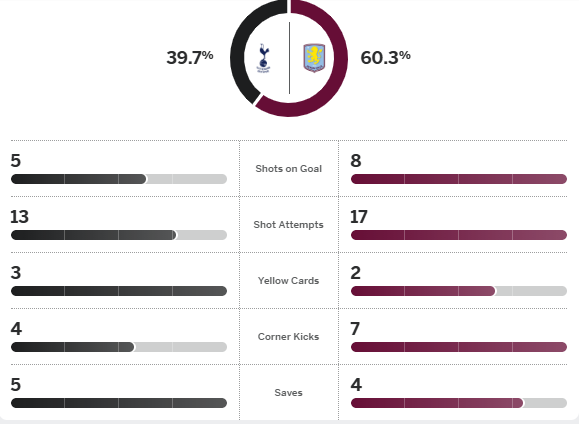 แอสตัน วิลล่า รูปเกมดีกว่าในครึ่งแรกจน เอมิเลียโน่ บูเอนเดีย ยิงขึ้นนำแถมจ่ายให้ มอร์แกน โรเจอร์ส จบสกอร์ทิ้งห่าง แม้ครึ่งหลัง ท็อตแน่ม ฮอตสเปอร์ ยกระดับขึ้นมาได้ วิลสัน โอโดแบร์ ตีไข่แตกนาที 54 แต่เวลาที่เหลือไม่สามารถตีเสมอ แพ้คาบ้าน 2-1 ไร้ชัย 4 นัดติดทุกถ้วย ตกรอบ เอฟเอ คัพ