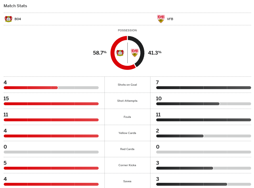 เกมมันจบตั้งแต่ครึ่งแรกเลยเมื่อ ไบเออร์ เลเวอร์คูเซ่น โดนไวแล้วคัมแบ็คไม่ได้เจอเลย สตุ๊ตการ์ท ยิงรัวๆโดยมี เยมี่ เลเวลิ่ง เหมาคนเดียวสองประตู ห้างยา มาตีไข่แตกได้ครึ่งหลังแต่ก็เป็นแค่ประตูปลอบใจหลังพ่ายต่อ ม้าขาว 4-1 หล่นมาอยู่อันดับ 4