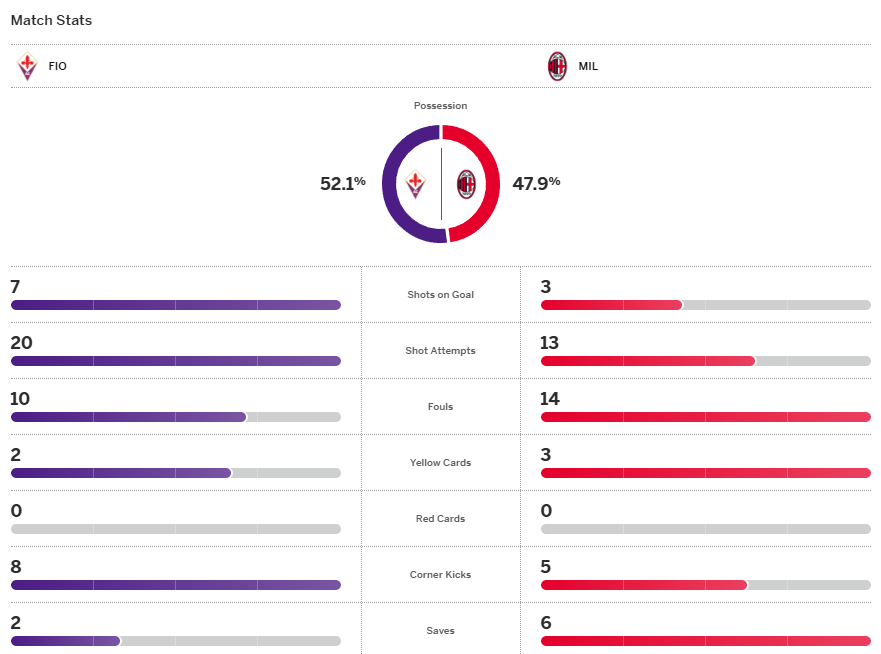 เอซี มิลาน เกือบไปแล้วหลังจากช่วงต้นเกมมีโอกาสหลายทีแล้วฝังไม่สำเร็จ เข้าครึ่งหลัง ฟิออเรนติน่า ดีขึ้นจนหาประตูนำพบ แต่ยังดีที่สำรองแบบ คริสโตเฟอร์ เอ็นคุนคู ช่วยได้ยิงในนาที 90 รอสโซเนรี่ เลยไล่เจ๊า ม่วงมหากาฬ ทันเวลา 1-1