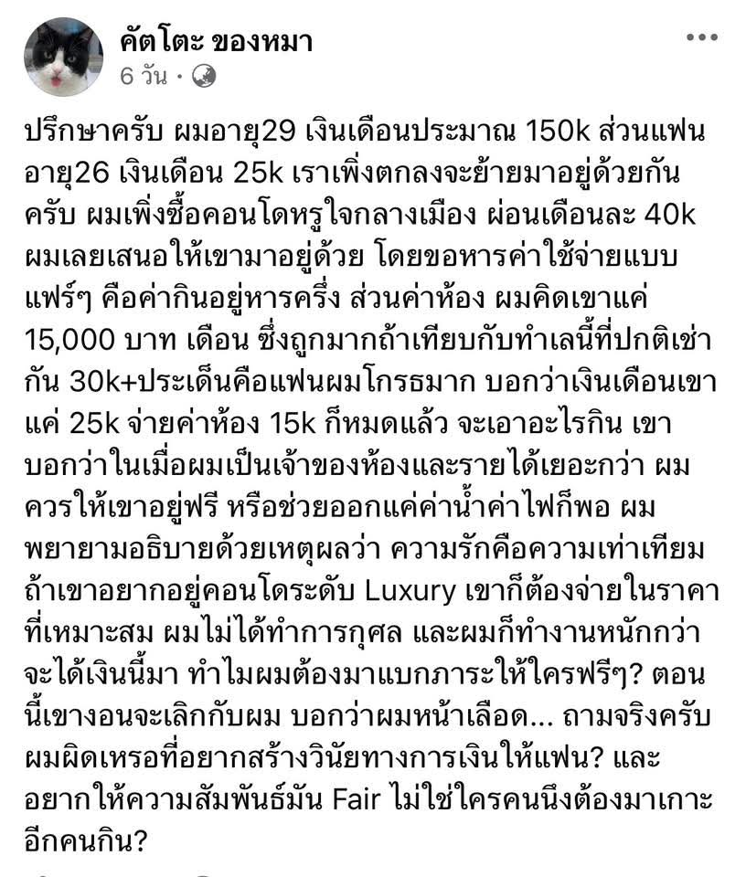 [RE]ดราม่า! หนุ่มเงินเดือน 150k หลังซื้อคอนโดหรูใจกลางเมือง พร้อมให้แฟนที่เงินเดือน 25k ช่วยจ่ายค่าห้อง 15k ต่อเดือน สุดท้ายทัวร์ลงหนักแฟนสาวจะขอเลิกแล้วเพราะเธอบอกว่าเราหน้าเลือดเกิน