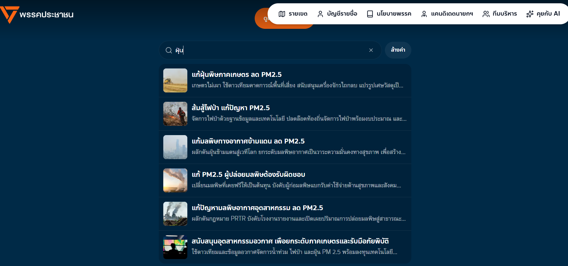 ถึงแม้ว่าจะเป็นนโยบายแปลกๆนะ ไม่นับรวมเซ็นทรัลสาขาดาวอังคารนะ แต่ผมอยากรู้ว่าเรื่องปัญหาฝุ่นเนี่ย มีนโยบายไหนออกมาพูดมั้ย