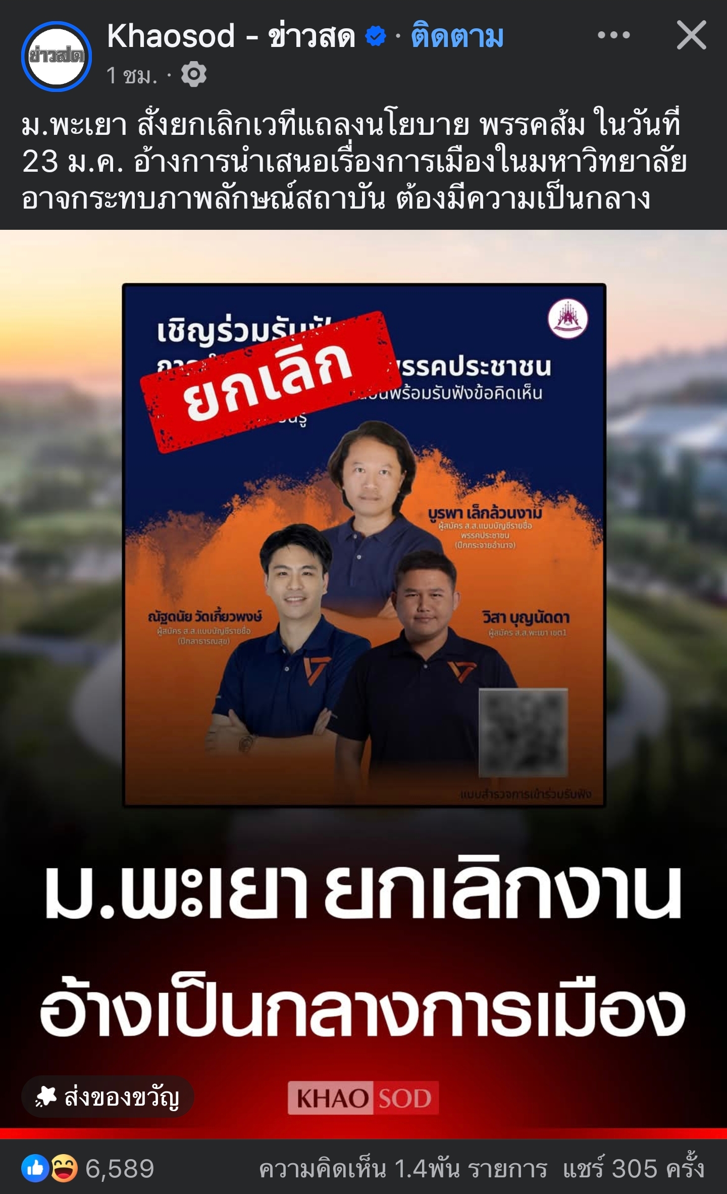 [RE: ม.พะเยา ยกเลิกงานแถลงนโยบายพรรคส้ม อ้างเป็นกลางทางการเมือง]