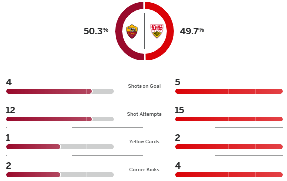 นิคโคโล่ ปิซิลลี่ หลุดไปยิงแสกหน้าออกนำท้ายครึ่งแรก แล้วครึ่งหลัง สตุ๊ตการ์ท มีโอกาสตีเสมอหลายครั้งทำไม่ได้ จนทดเจ็บ 90+2 ปิซิลลี่ มิดฟิลด์เด็กปั้นผลิตอีกสกอร์ โรม่า เปิดบ้านชนะ 2-0 ขึ้นอันดับ 6 ยูโรป้า ลีก การันตีการเข้ารอบเพลย์ออฟเป็นอย่างน้อย