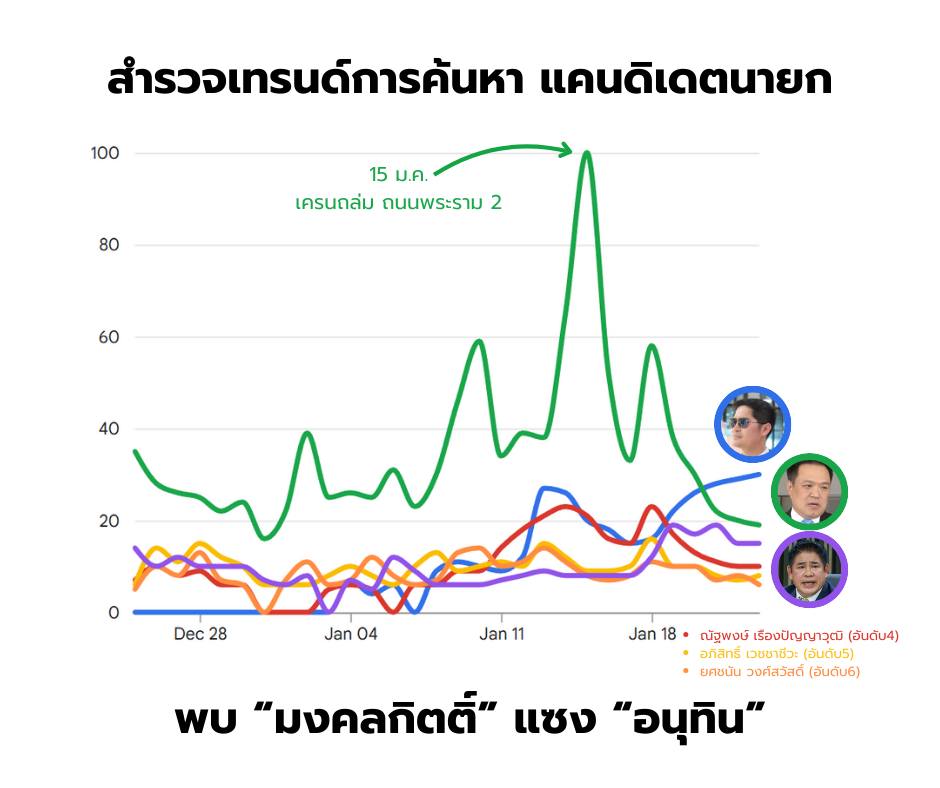 อย่างไรก็ดี กระแสนี้อาจไม่ได้สะท้อนถึงคะแนนการเลือกตั้งที่จะถึงนี้ได้ทั้งหมด เพราะถ้าเราดูช่วงที่มีการค้นหามากที่สุด คือวันที่ 15 ม.ค. ผู้คนค้นหาชื่อ "อนุทิน" มากที่สุดจากข่าวใหญ่ในวันนั้น คือเหตุการณ์ เครนถล่มบริเวณถนนพระราม 2 นั่นเอง...